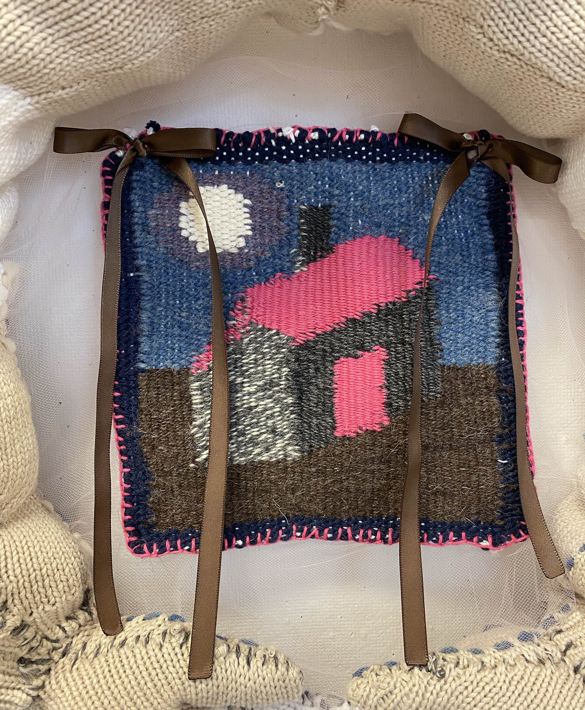 Hand sewn wreath made with a sweater, poly fill, hand-loom weaving, tulle, and ribbons; approximately 30x32”